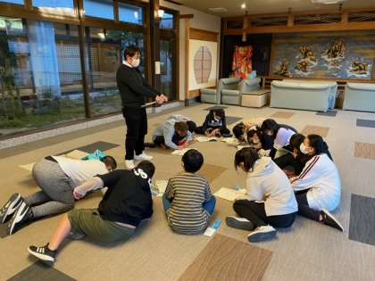 自分たちの部屋へ行ったら、すぐに避難訓練です。避難経路を確認します。