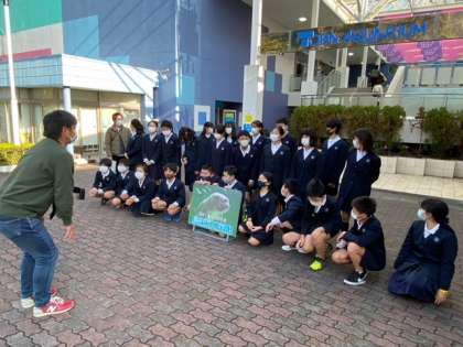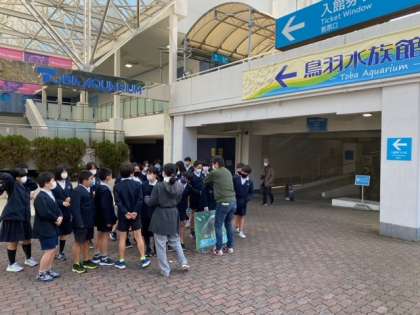 鳥羽水族館に到着したら、まずは集合写真を撮ります。「はい、チーズ!!」