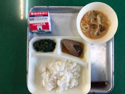 なまりぶしのしょうが煮、なめこみそ汁、ほうれんそうのごまあえ、ご飯、牛乳