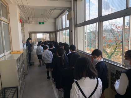 1組は図書をしました。給食前だったので、机の上にナフキンやエプロンの準備をしました。図書室は教室のすぐ隣ですが、廊下に静かに並んで移動しました。