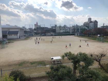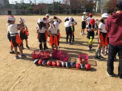 2組は運動場で体育科の学習をしました。フラッグを取り付けるのに一苦労…付けたあとは、みんなでフラッグの取り合いをしました。