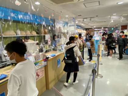 水族館のショップで、お買い物です。自分や家族のことを考えながら、「ん〜、どれにしよう?」