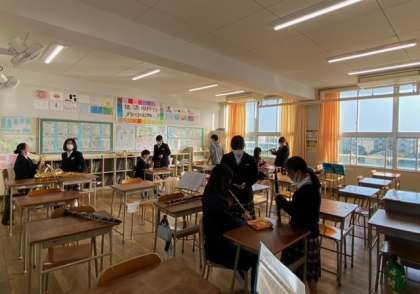 吹奏楽部のようすです。楽器演奏を体験しました。