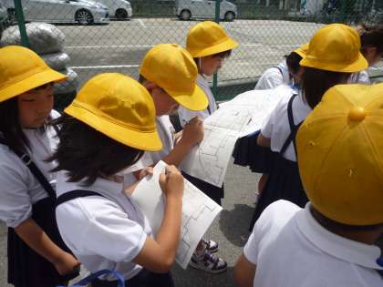 3年生は、社会科の学習で、自分たちの住んでいる身近な地域について、土地利用の様子(商店、工場、マンションや住宅など)や主な公共施設(中学校や公園、交番など)、古くからある建造物(寺や神社など)を観察、調査し、白地図にまとめます。調べて分かったことを発表し、自分たちの住んでいる身近な地域の様子についてくわしく理解していきます。今日の校区たんけんでは、どんな発見があったのかなぁ?