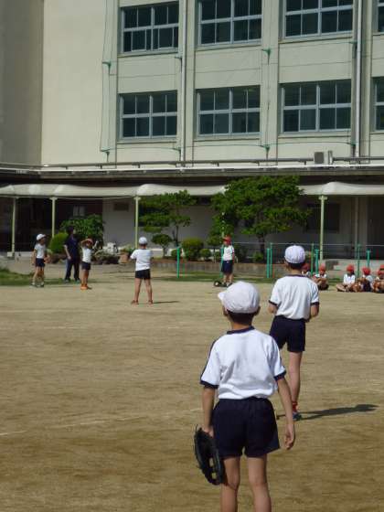 球技クラブは、運動場でソフトボール。得意な子も、ちょっと苦手な子も楽しんでいました。