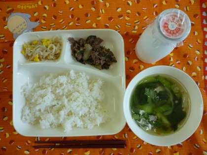 プルコギ、とうふのスープ、甘酢あえ、ご飯、牛乳
