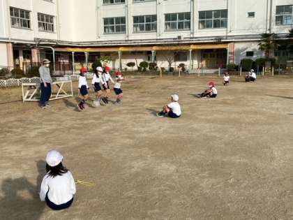 1組の子どもたちが、やわらかい陽ざしの下、運動場でなわとびをしていました。