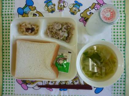 豚肉と野菜のいためもの、すまし汁、金時豆のおこわ、食パン、マーガリン、牛乳