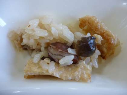もち米に鶏肉、金時豆、うすあげ、しめじの入ったおこわです。焼き物機で蒸し焼きにしています。