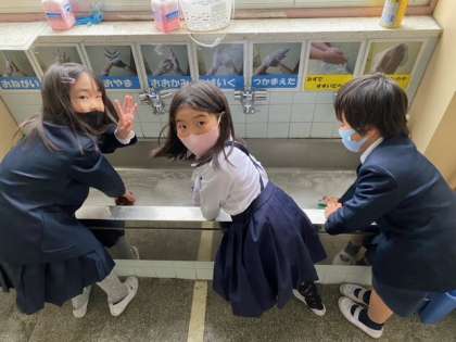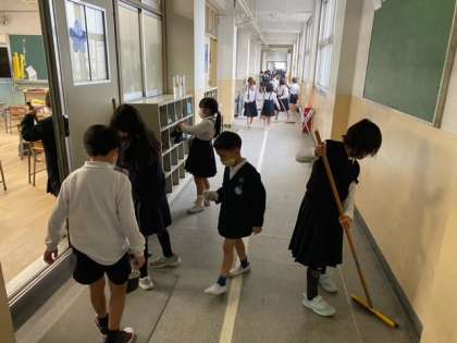 そうじの時間です。教室・廊下・階段・トイレなど 子どもたちが協力して、自分たちの学校をきれいにしています。