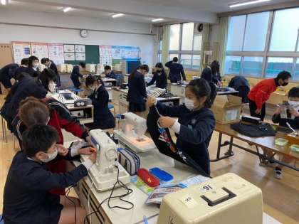 子どもたちが、ミシンを使って「エプロンづくり」に取り組んでいます。(3限2組と6限1組のようすです)