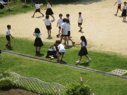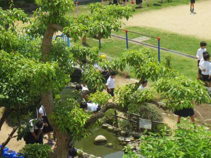 池の周囲には、水生動物に関心のある子どもたちが沢山あつまり、水面をのぞきこみ、手を水中に入れ、調べ遊びをしていました。