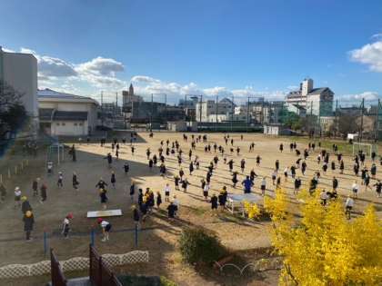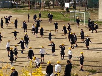 1限後の休み時間です。早速、子どもたちが運動場になわとびをもって出てきました。