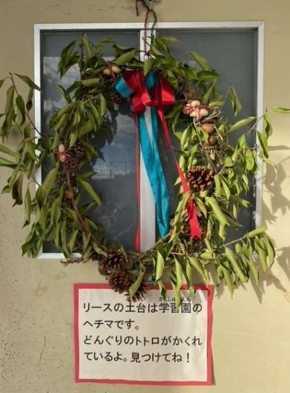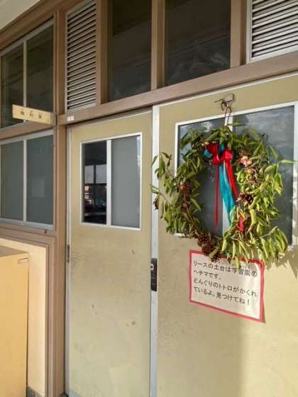 理科室のドアに、理科の先生が作成したきれいな「リース」が飾られています。