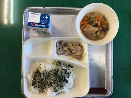 「令和2年度学校給食献立コンクール最優秀賞」に選ばれた献立です。献立のねらいは「寒い季節を元気に過ごすために、食欲がわく献立を考えました。ちりめんじゃことだいこん葉でごはんが進む一品、にんにくとかくし味の白みそで風味良く焼いた豚肉、旬の冬野菜を使いでんぷんでとろみをつけた体が温まる煮ものを組み合わせました」です。