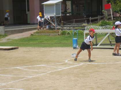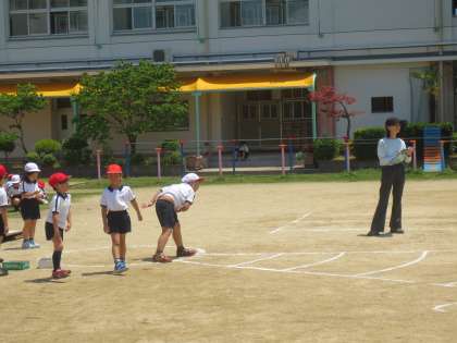 1年生がソフトボール投げの記録をとっています。はじめて挑戦する子どもいて・・・遠くへ投げるのは難しそうです。