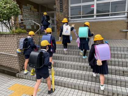 雨があがりきらない中での登校風景です。今日から懇談期間中は5時間授業です。