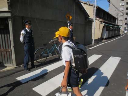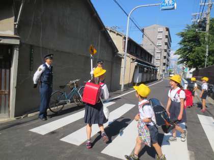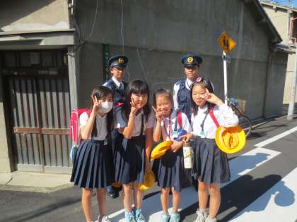 下校時刻に警察官の方が、パトロールを兼ねて見守りをしてくださいました。子どもたちは少し緊張した様子で「さようなら」と元気にあいさつをしていました。