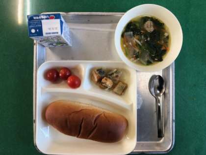 さけのマリネ、肉だんごと麦のスープ、プチトマト、パン、牛乳