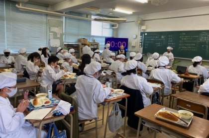 給食当番の子どもたちが配膳をしています。「いただきます」のあいさつで食べ始めました。