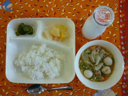 八宝菜、きゅうりの辛みづけ、ミックスフルーツ(缶)、ご飯、牛乳