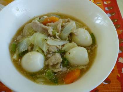 豚肉、うずら卵を主材にたまねぎ、キャベツ、たけのこ、にんじん、ピーマン、しいたけの入った八宝菜です。
