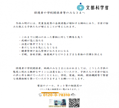 子どもの態度に現れる微妙なサインに注意を払っていただき、何かお気付きのことがありましたら、学校へご連絡ください。