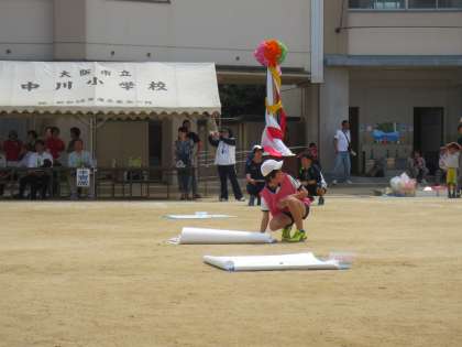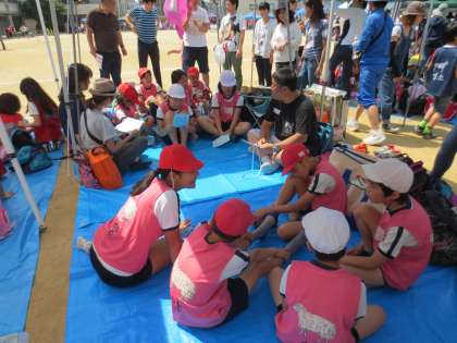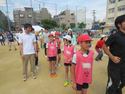 準備運動の後、競技の打ち合わせをしています。巽南小学校は巽東小学校との連合チームで出場しています。運動会競技は名前書きリレー、地図パズル、大綱引きなどがありました。