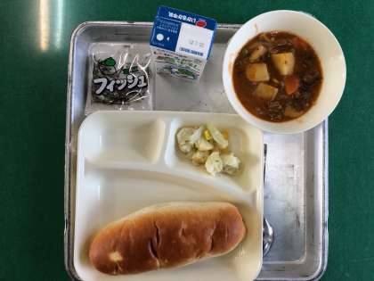 ビーフシチュー、カリフラワーのピクルス、ミニフィッシュ、おさつパン、牛乳