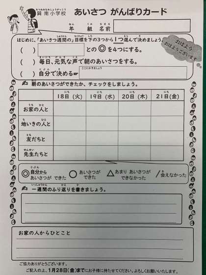 子どもたちには「あいさつがんばりカード」を配布します。すすんであいさつができるように頑張りましょう。