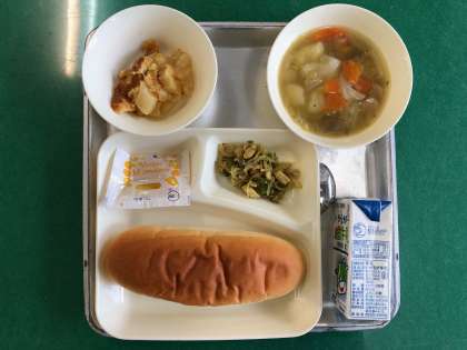 ポトフ、カレーソテー、桃のクラフティ、コッぺパン、マーマレード、牛乳