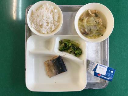さばのみそ煮、五目汁、ブロッコリーのごまあえ、ご飯、牛乳