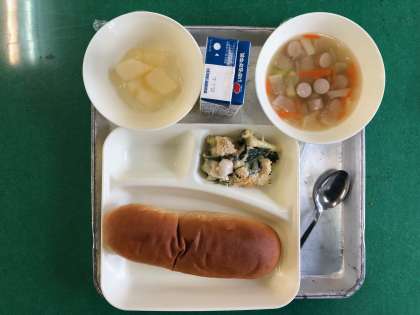 マカロニグラタン、ウインナーのスープ、和なし(かんづめ)、おさつパン、牛乳