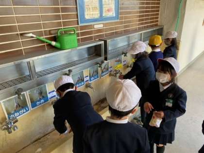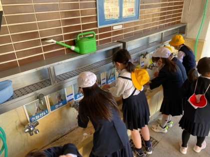 休み時間の終わりには、ていねいに手を洗い、教室に向かいます。