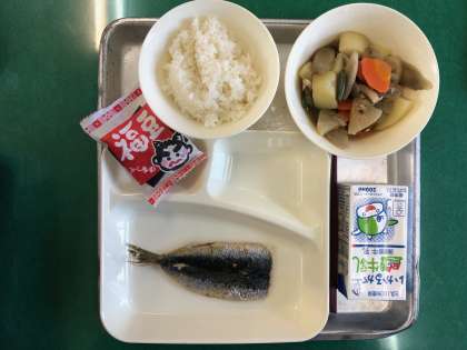 いわしのしょうがじょうゆかけ、含め煮、いり大豆、ご飯、牛乳