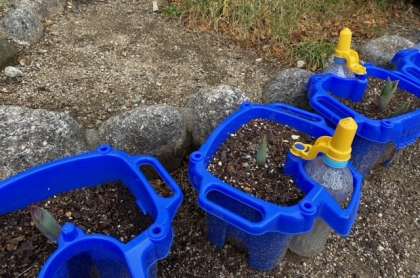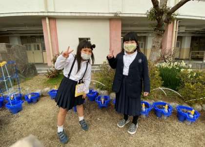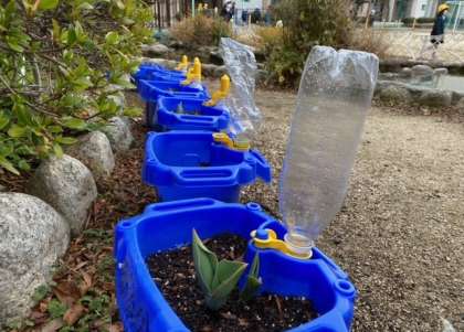 レインボーパークにある1年生のプランターでは、チューリップが花を咲かせる準備をしていました。