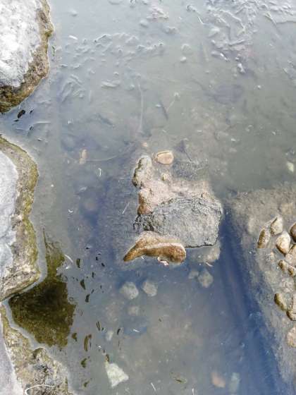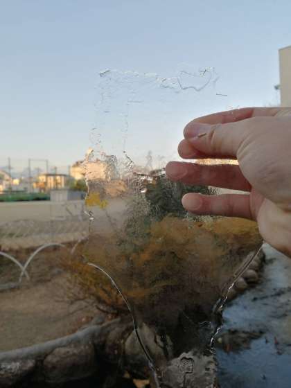 「こんなに大きな氷が……」 朝早く出勤した教員が氷を手にしています。