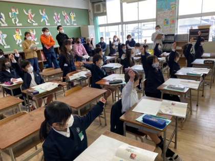 子どもたちはしっかりと先生の話を聞き、発問には意欲的に手を挙げていました。指名された子どもの発表にハンドサインで答えています。