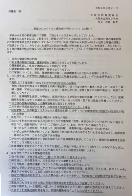 昨日までの重点措置が延長されました。大阪市教育委員会よりの配付文書を児童が持ち帰っていますのでご覧ください。