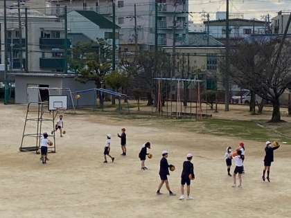 運動場と体育館で、4〜6年生の子どもたちがクラブ活動を楽しんでいます。