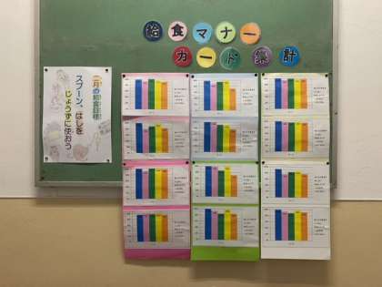 給食週間を終えて、児童の「給食マナーがんばりカード」の結果が掲示されています。