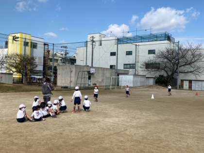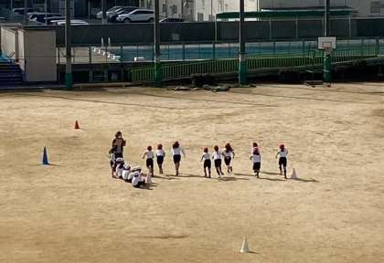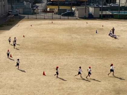運動場で持久走に挑戦しています。子どもたちの間から「がんばれー」と応援の声が上がっていました。