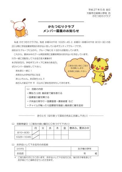 かたつむりクラブは、毎週 水曜日の午前10:25〜10:45と水曜日〜金曜日の午前8:10〜8:30の各20分間に学校図書館開放をしている図書館ボランティアグループです。