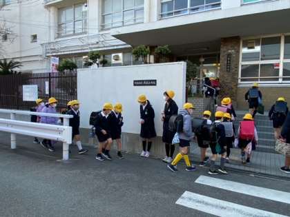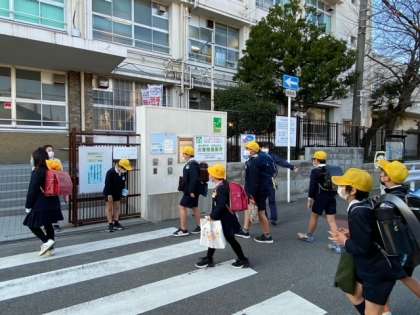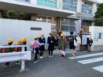 代表委員の児童が、正門で元気のよいあいさつとともに、募金への協力を呼びかけています。