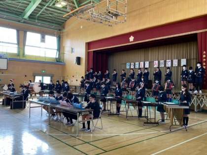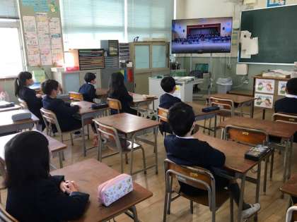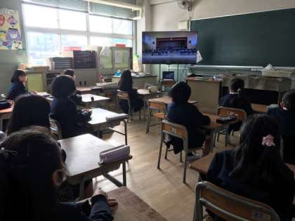 演奏のようすは「Teams」を通して各学級に映されました。(1〜4年生は感染対策のため教室で見ています。)