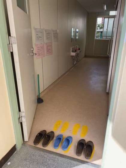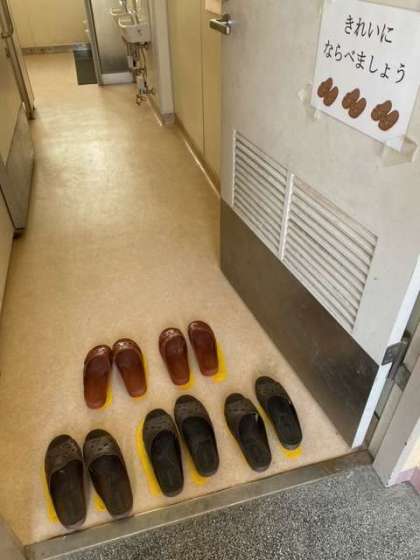 各トイレの出入り口の床にスリッパの足形を設置しました。数も3足から5足に増やし使いやすくしました。