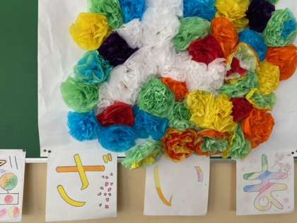 色とりどりの花がぎっしり詰まっています。言葉のカードにも卒業を祝う絵や花が描かれています。