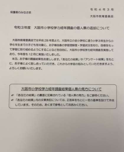 昨年12月に全市で実施された「大阪市小学校学力経年調査」の結果(個人票)が届きました。