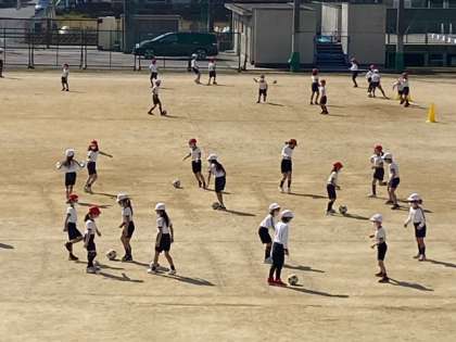 2年生(1・2組合同)の体育科では、運動場いっぱいに広がってサッカーゲームをしていました。