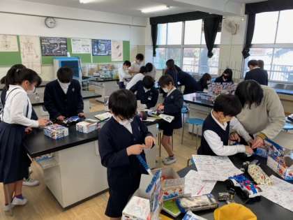 5年生(1組)の理科です。子どもたちが集中して、モーターカーづくりをしています。